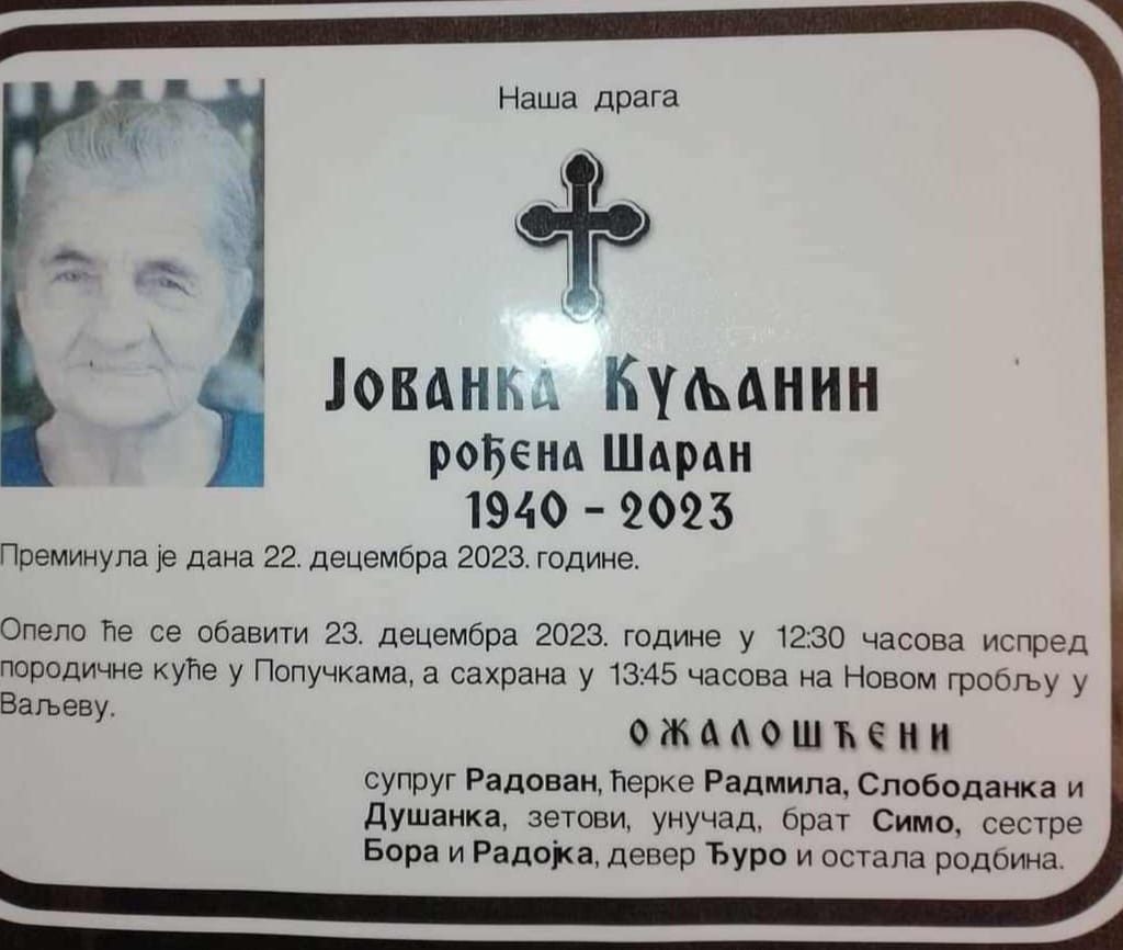 Ин Мемориам –Јованка Куљанин 1940 – 2023 admin 23/12/2023 Ин Мемориам Leave a comment 542 Views Share Facebook Twitter Stumbleupon LinkedIn Pinterest