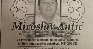 Miroslav Antic 1964 – 2017 Tužna srca javljamo rodbini i prijateljima da je naš dragi Miroslav Antic preminuo dana 25.04.2017. u 53. godini života. Sahrana pokojnog Miroslava Antica ce se obaviti u Petak 28-04-2017 Opelo je u 11-30 u crkvi sv Arhidjakon Stefan Keysborough Sahrana poslje na Bunurong Memorial …