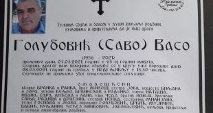 Ин Мемориам – Васо (Саво) Голубовић 1956-2021 Тужним срцем и болом у души јављамо родбини, кумовима и пријатељима да је наш драги Васо (Саво) Голубовић преминуо дана 27. марта 2021. године у 65. години живота. Сахрана драгог нам покојника обавиће се у кругу уже породице дана 28. марта 2021. године …
