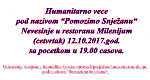 Read More »Humanitarno veče pod nazivom “Pomozimo Snježanu“, Nevesinje restoran Milenijum 12.10.2017.god. u 19:00 časova