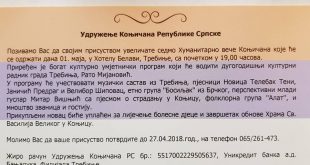 Pozivamo Vas da svojim prisustvom uveličate sedmo Humanitarno veče Konjičana koje će se održati dana 01. maja, u Hotelu Belavi, Trebinje, sa početkom u 19,00 časova. Priređen je bogat kulturno umjetnički program koji će voditi dugogodišnji kulturni radnik grada Trebinja, Rato Mijanović. U programu će učestvovati muzički sastav …