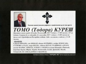 In Memoriam – Tomo ( Todora) Kureš admin 11/11/2017 Ин Мемориам Leave a comment 3,218 Views Share Facebook Twitter Google + Stumbleupon LinkedIn Pinterest