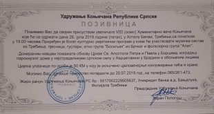 Позивамо Вас да својим присуством увеличате Осмо Хуманитарно вече Kоњичана које ће се одржати 26.07.2019.године, у Хотелу Белави, Требиње. Према најавама, очекује се највећи до сада скуп. Приређен је богат културно умјетнички програм. Специјални гости доктори из Ниша који су нам помагали за вријеме рата. Скупштина удружења одржаће …